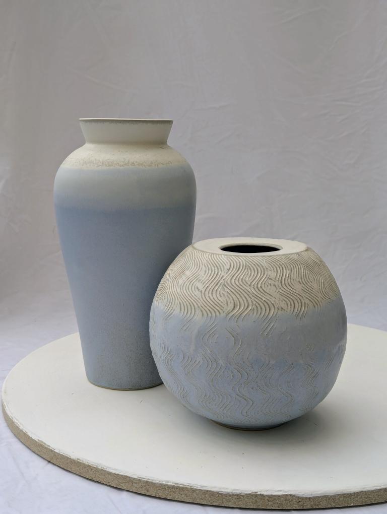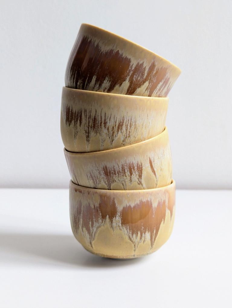 Je travaille la porcelaine et le grès, roux ou blanc, et façonne mes pièces essentiellement au tour de potier. Des pièces décoratives et utilitaires aux formes sobres, habillées des émaux que je fabrique et cuites en four électrique, gaz ou bois. J’aime jouer sur les contrastes entre émaux ou terre-émail, les dégradés et effets de superpositions.
